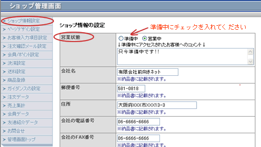営業状態 項目で、 @準備中 のラジオボタンにチェックを入れます。 A準備にアクセスされたお客様へのコメント のテキストボックスに、表示したいコメントを入力します。 |